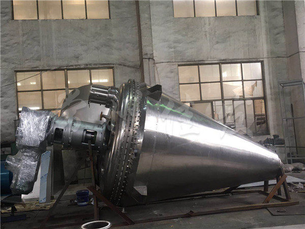 錐形螺帶真空干燥機是一種利用螺帶將物料旋轉提升及圓錐夾套、空心螺帶內同時通入傳熱介質(如熱水、導熱油、蒸汽等),使加熱后物料從四周提升并從中間下落,快速不斷的循環(huán)翻轉,并通過筒體內抽真空將水汽及時帶走。