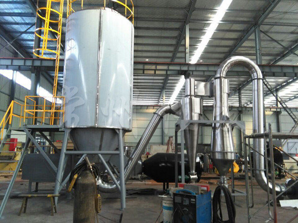 本機是將料液壓入壓力噴嘴霧化成微小霧滴,在塔內與熱風以對流的方式完成干燥,獲得顆粒產品。