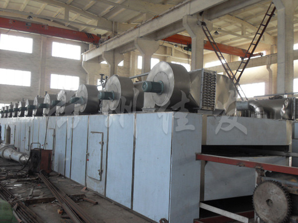 物料由加料器均勻地鋪在網(wǎng)帶上,網(wǎng)帶一般采用12-60目不銹鋼絲網(wǎng),由傳動裝置拖動在干燥機內(nèi)移動。干燥機由若干單元組成,每一單元熱風(fēng)獨立循環(huán),部分尾氣由專門濕風(fēng)機排出,廢氣由調(diào)節(jié)閥控制,熱氣由下往上或由上往下穿過鋪滿物料的網(wǎng)帶完成熱量與質(zhì)量傳遞的進程,帶走物料的水份。網(wǎng)帶緩慢移動,運行速度可根據(jù)物料溫度自動調(diào)節(jié),干燥后的成品連續(xù)落入收料器中。上下循環(huán)單元根據(jù)用戶需要可靈活配備,單元數(shù)量亦可根據(jù)需要選取。
