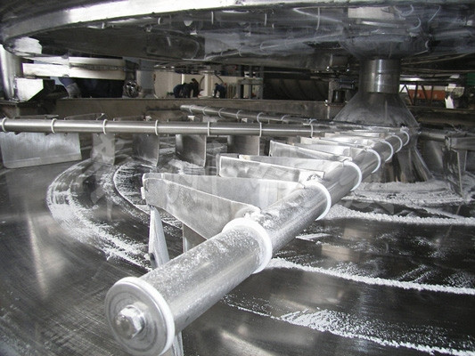 The wet material is continuously added to the first layer of drying plate on the upper part of the dryer by the feeder, and the rake arm with rake blades rotates to continuously flip the material. The material flows through the surface of the drying plate along an exponential spiral, and the material on the small drying plate is transferred to the outer edge and falls to the outer edge of the large drying plate below. On the large drying plate, the material moves inward and falls into the next layer of small drying plate from the middle discharge port. The large and small drying plates are arranged alternately up and down, allowing materials to continuously flow through the entire dryer. The middle drying plate is filled with heating medium in the form of saturated steam, hot water, and thermal oil. The heating medium enters from one end of the drying plate and exits from the other end. The dried material falls from the last layer of the drying plate to the bottom layer of the shell, and is finally transported by the rake blades to the discharge port for discharge. Moisture overflows from the material and is discharged through the moisture discharge port located on the top cover. The moisture in the vacuum disc dryer is extracted through the vacuum pump port located on the top cover. The dry materials discharged from the bottom layer can be directly packaged. By equipping auxiliary machines such as finned heaters, solvent recovery condensers, bag dust collectors, dry material backmixing mechanisms, and induced draft fans, the production capacity of drying can be improved. Drying paste like and heat sensitive materials can facilitate solvent recovery and allow for pyrolysis and reaction operations.